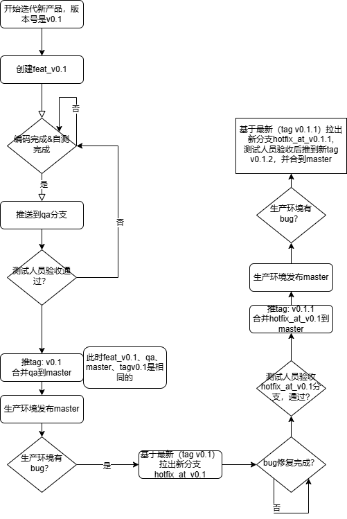 此时生产环境有bug,就根据v0.1 tag拉取新分支hotfix_at_v0.1,并修改代码,修改后让qa单独验收此分支,无误后推到新tag v0.1.1,并将该分支合并到master(如有必要,需要合并到feat_v0.2)。cd-ci拉取master分支并构建。