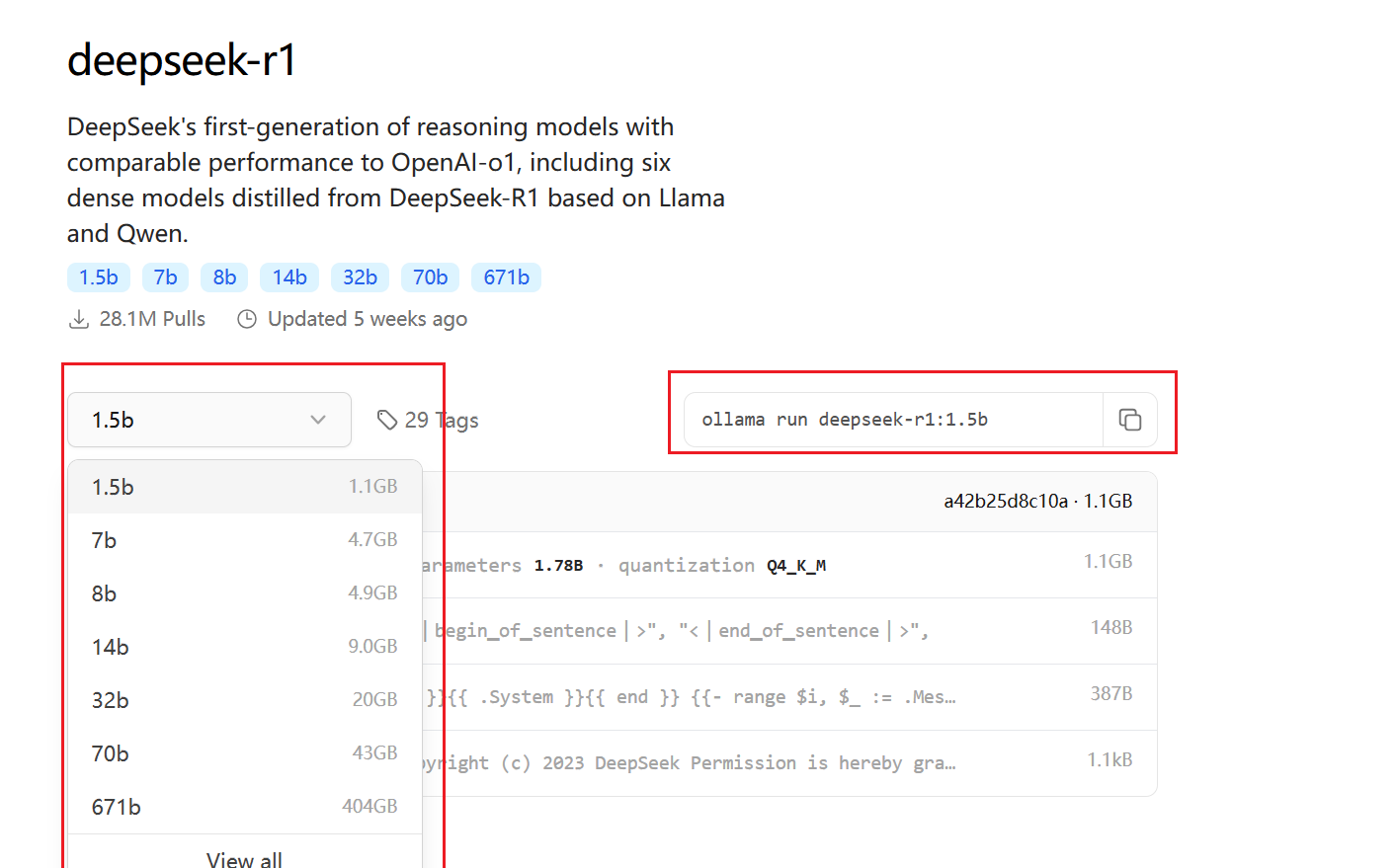 访问deepseek-r1模型页面,选择自己需要的版本,此处使用最小的。