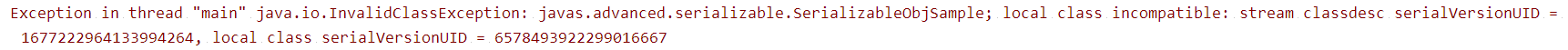 str2 = null没有出现异常java.io.InvalidClassException,且i和str的值已正确回显,str2为null是因为之前序列化到文件时SerializableObj2Sample还没有这个属性。对比可以发现,没有出现异常的原因是序列化前后serialVersionUID没有变化。